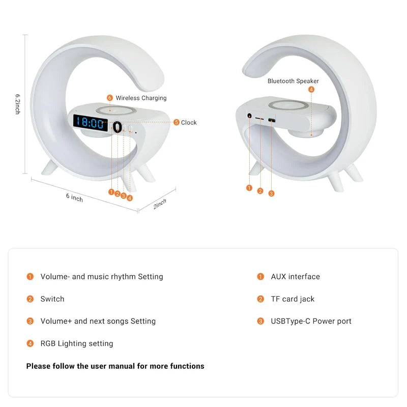 G-Shaped RGB Atmosphere Lamp with 15W Wireless Charger, Bluetooth Speaker, Alarm Clock & Desk Light for Bedside & Room Décor| 10-Year Warranty
